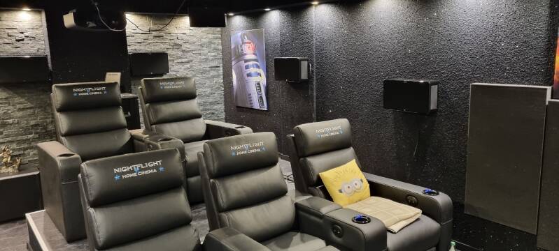 Beispiel eines Heimkino mit unserer Flüssigtapete in Anthrazit mit kleinen Silbereffekten: